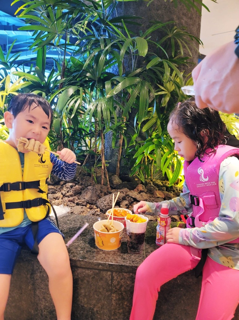 아이들과 다양한 풀에서 즐겁게 즐기고 놀다 보니 금세 시간이 지났고 배고파진 아이들을 위해 매점을 이용해 오뎅꼬치와 콜팝으로 허기를 달랬습니다.