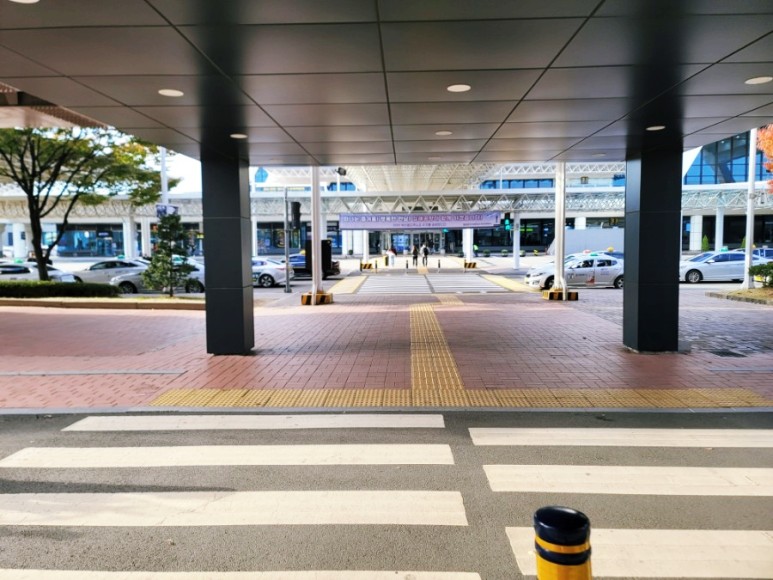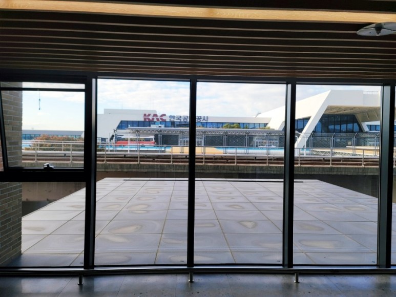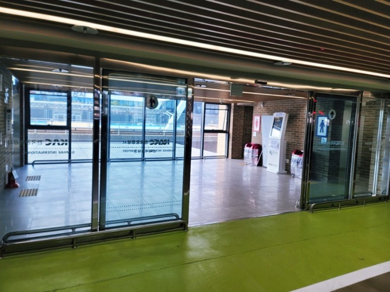 1층에 엘리베이터가 도착하면 길을 건너기만 하면 도착하는 김해공항.